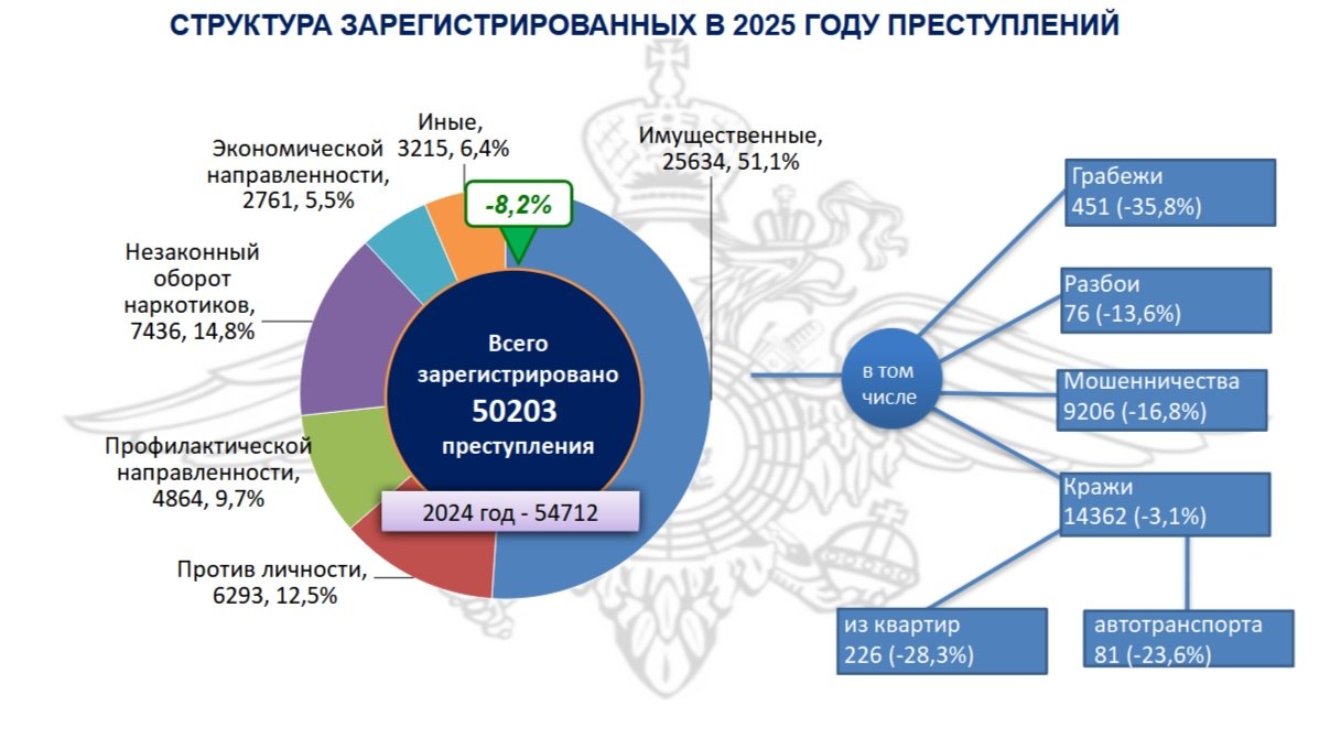 Количество зафиксированных преступлений в сравнении с 2024 годом снизилось на 8%, а поступивших сообщений от граждан – на 3,2%.