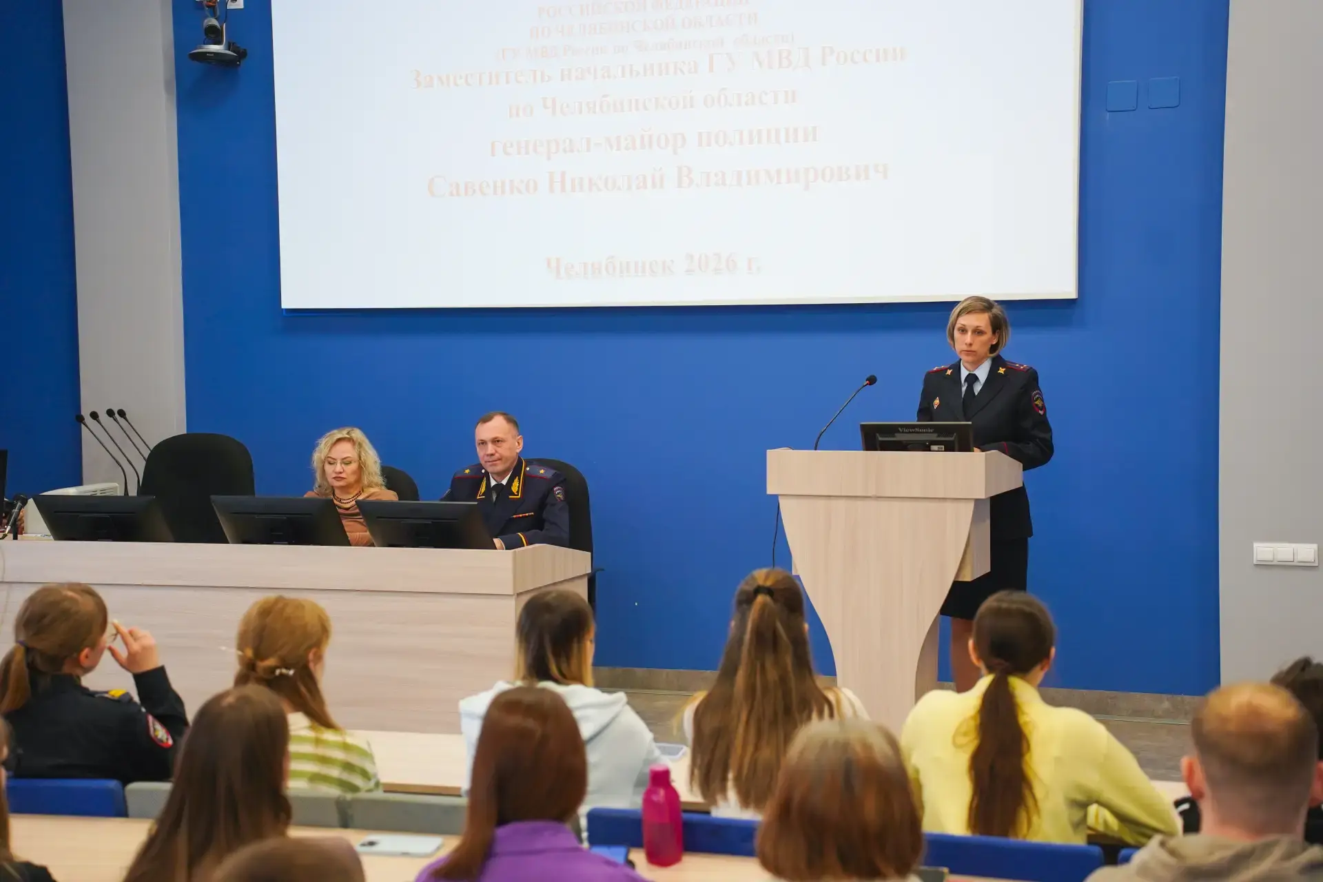 В Челябинске на базе Южно-Уральского государственного университета заместитель начальника ГУ МВД России по Челябинской области генерал-майор полиции Николай Савенко провел встречу со студентами юридического института. В мероприятии также приняли участие сотрудники кадрового аппарата областного полицейского главка.