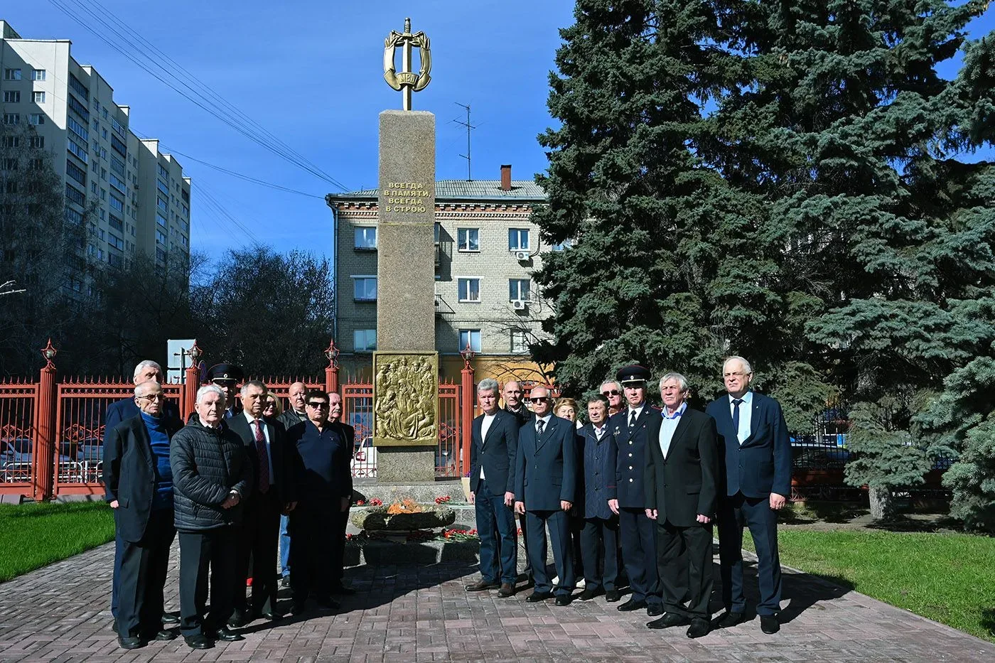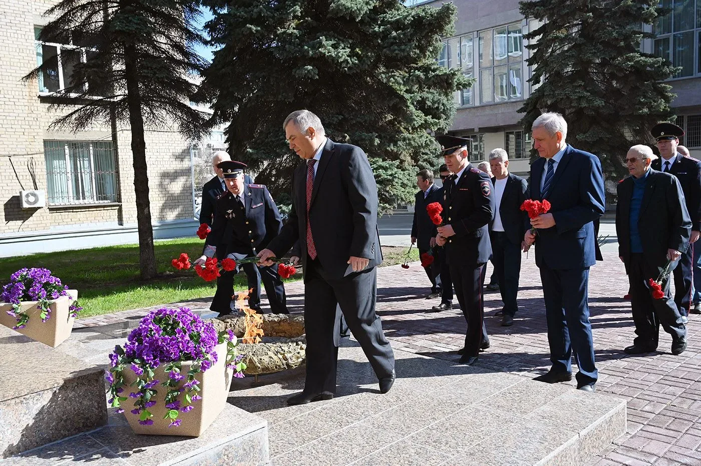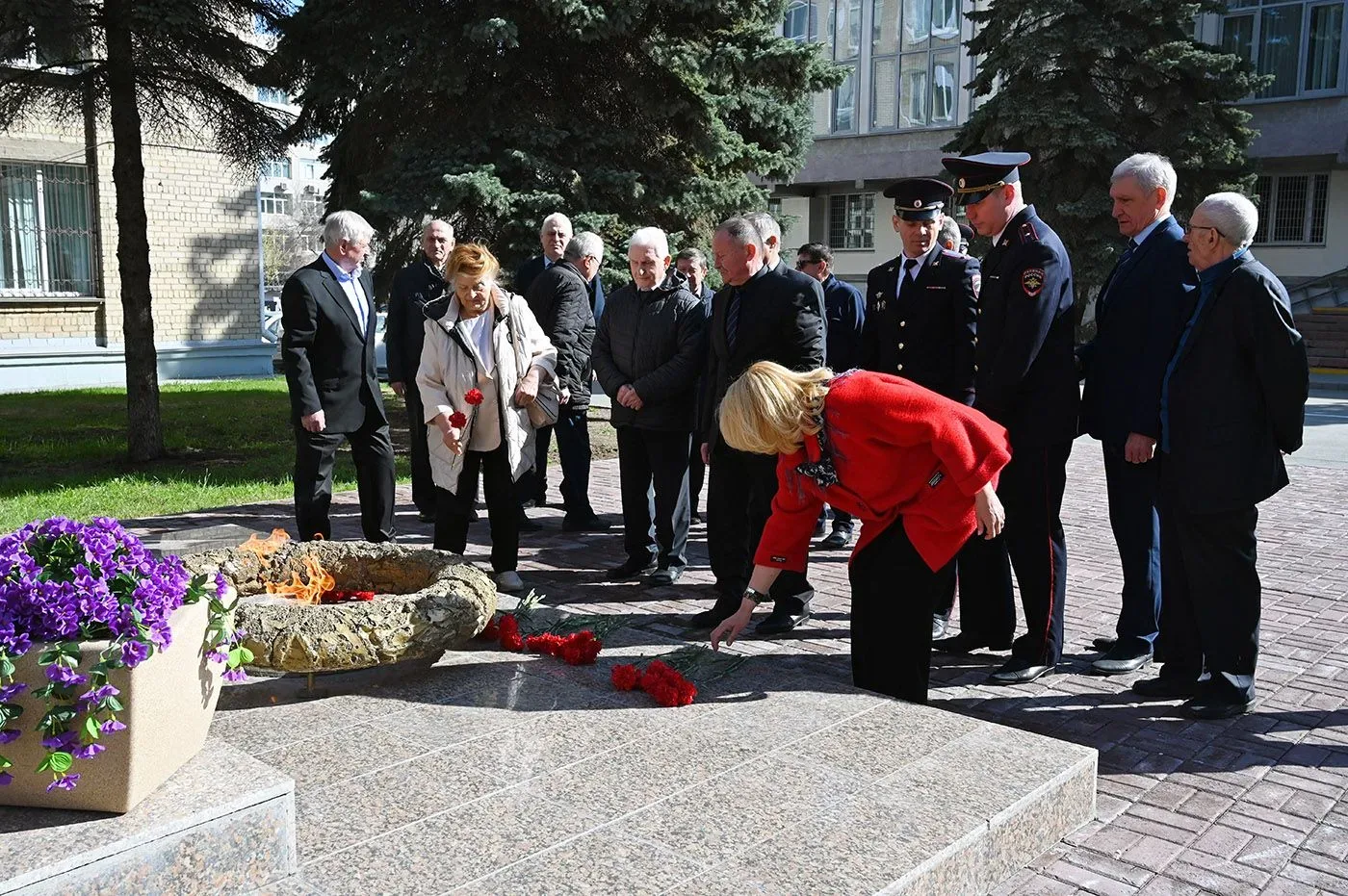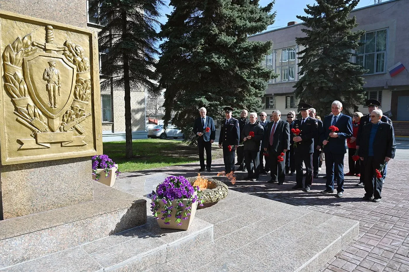 После состоявшегося митинга участники возложили цветы к Вечному огню у подножия мемориальной стелы. Почтив память героев символической минутой молчания, действующие сотрудники в знак уважения отдали приветствие, приложив правую руку к форменной фуражке.