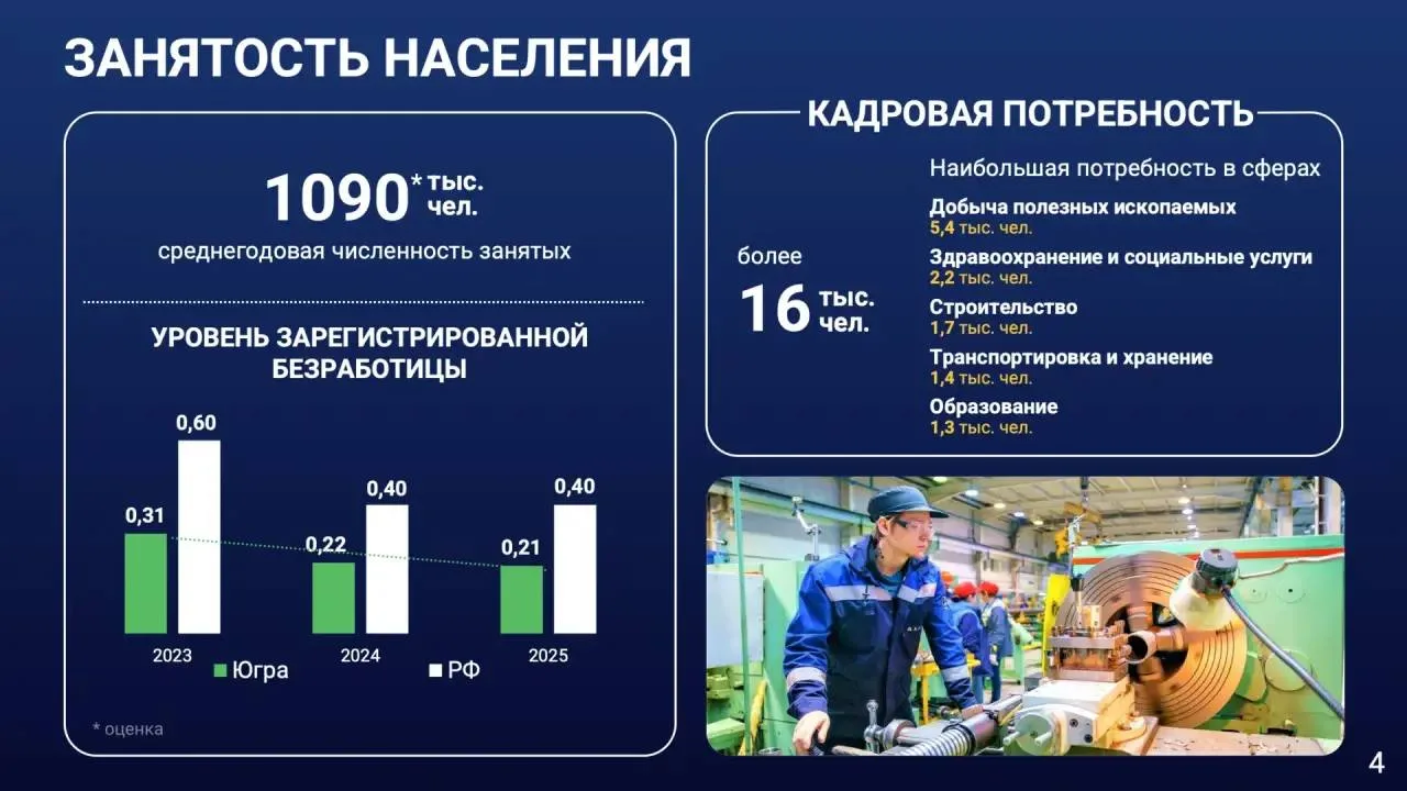 В 2025 году численность занятых в экономике составила 1 090 000 человек. Уровень регистрируемой безработицы – 0,21%, это почти в два раза ниже общероссийского показателя. Вместе с тем сохраняется высокая потребность работодателей в кадрах – более 16 тысяч свободных рабочих мест. Это серьезный вызов, который требует системного решения.