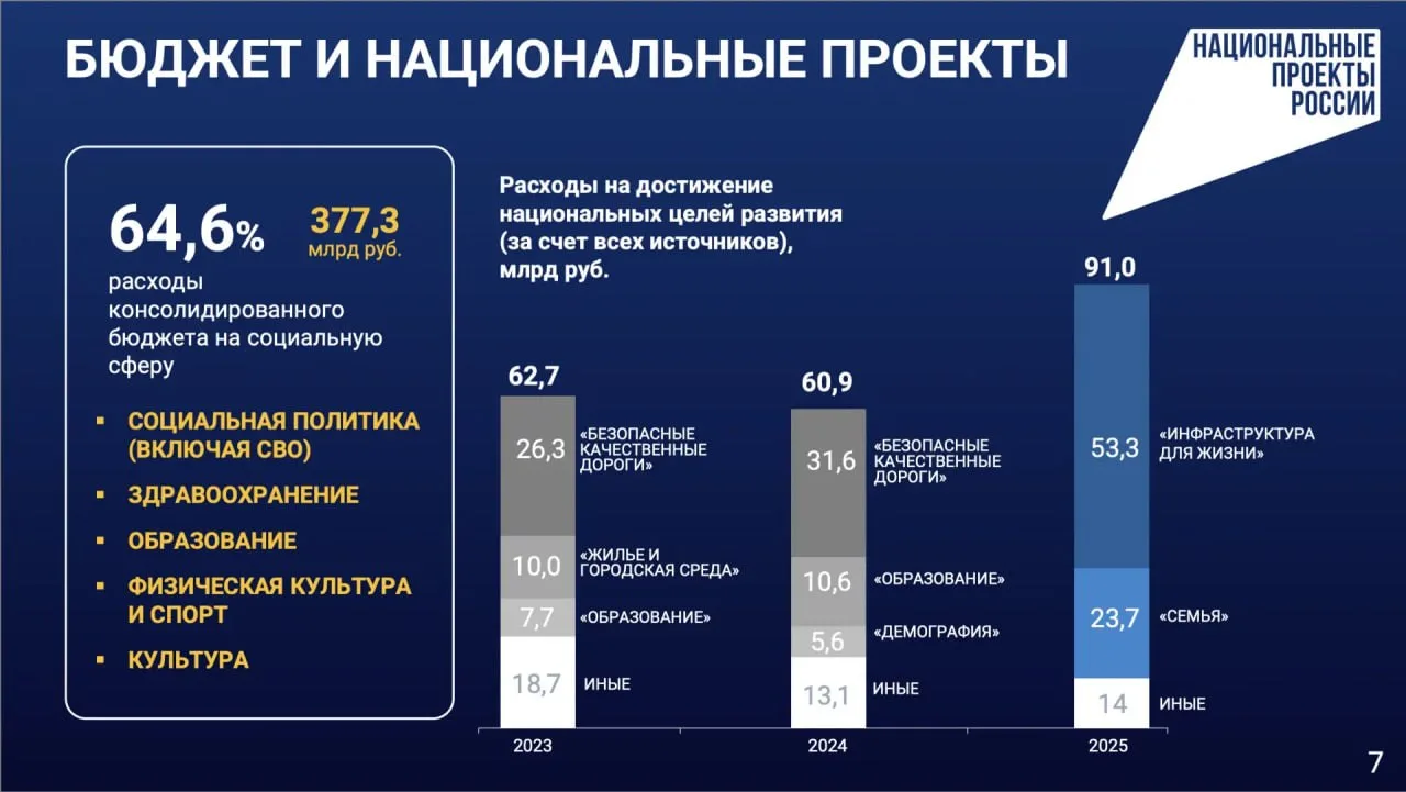 В 2025 году почти 65% расходной части бюджета было направлено на социальные нужды. Это позволило в полном объеме выполнить все социальные обязательства: обеспечить поддержку участников специальной военной операции и их семей, предоставить социальные выплаты и провести индексацию заработных плат.