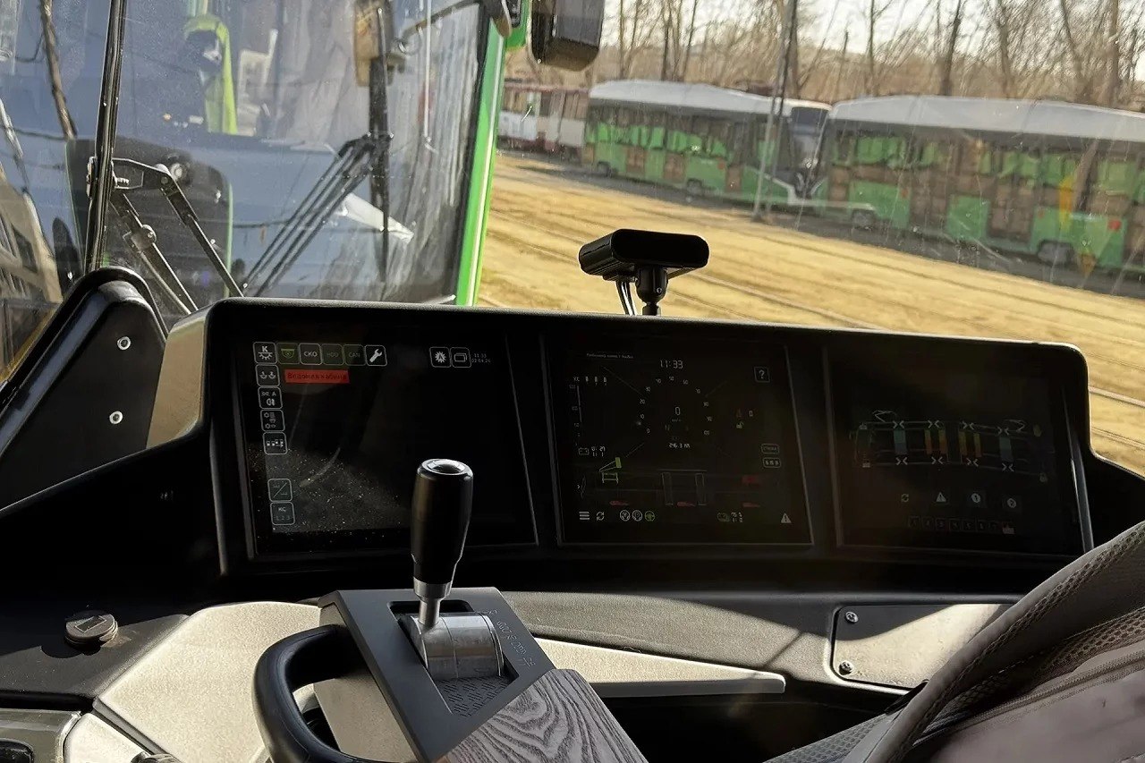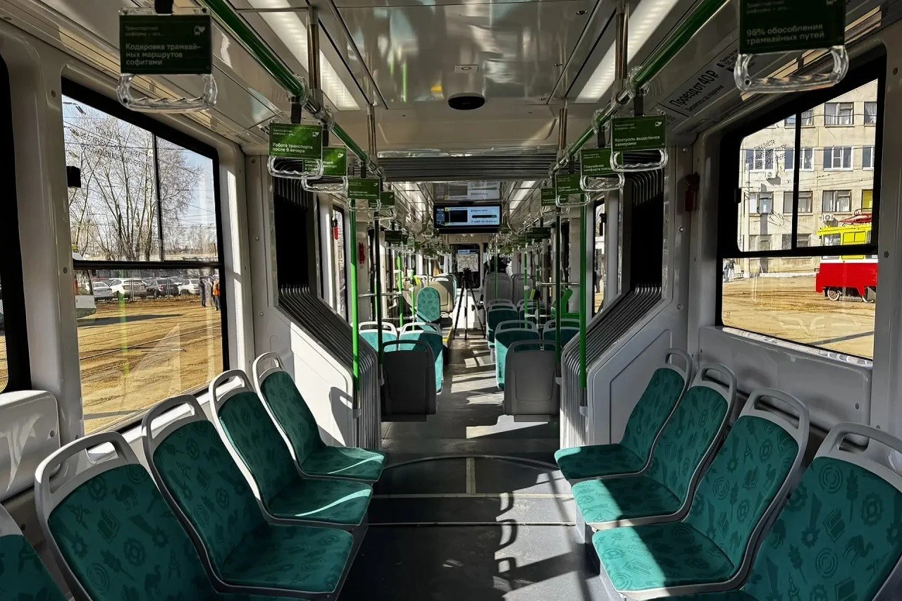 Панель в кабине водителя электронная: наряду с кнопками — сенсорные экраны. При неисправности система с искусственным интеллектом сама отправит сообщение о проблеме прямо на монитор.Также в трамвае установлен аппарат по продаже разовых билетов — устройство принимает даже наличные и выдает сдачу. Салон дополнительно оснащен валидаторами и камерами видеонаблюдения для безопасности пассажиров.