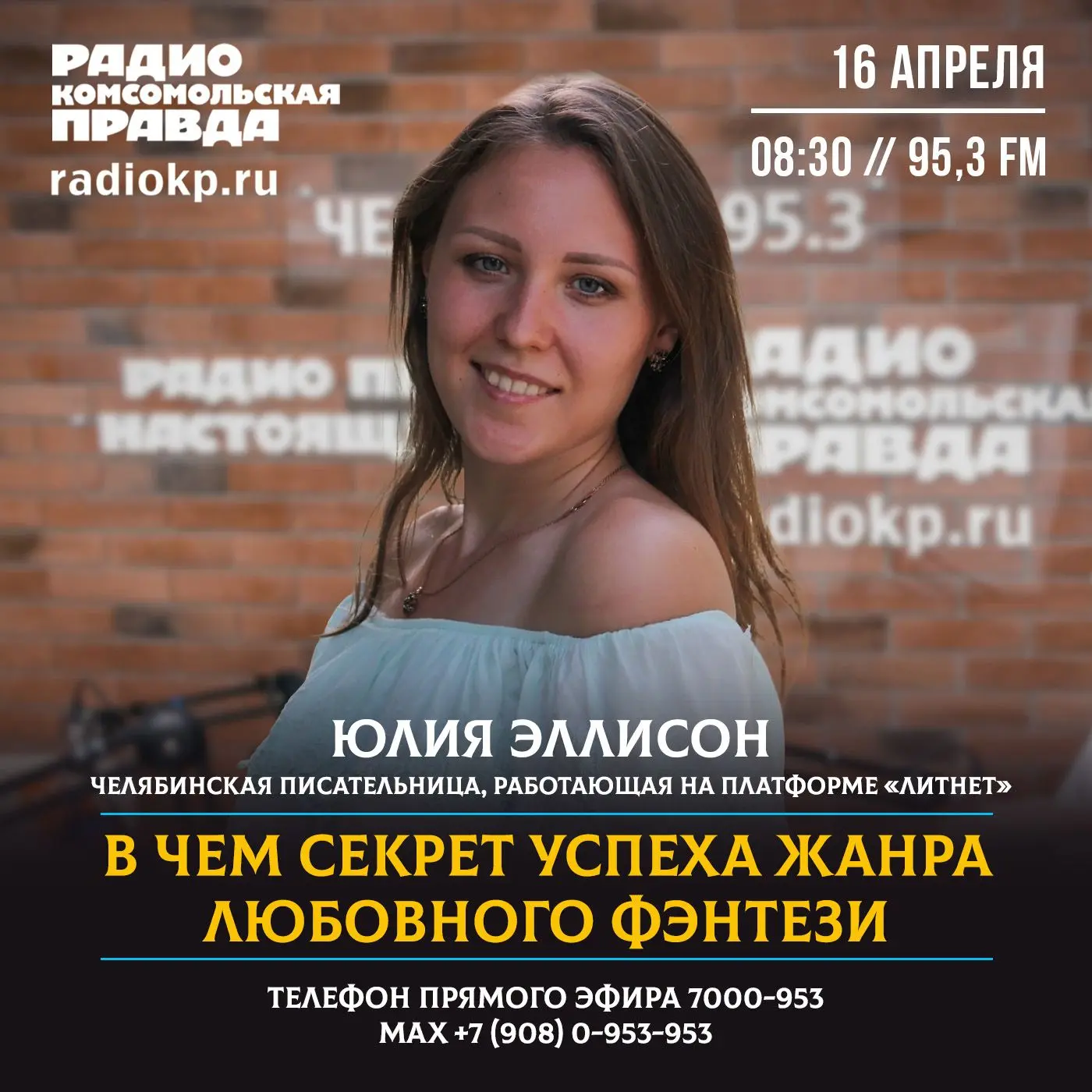 Челябинцы довольно много читают, судя по опросам. Причем самыми популярными жанрами у горожан оказались фэнтези – их выбирают почти 40% аудитории. Но и в этом, казалось бы, всем знакомом жанре есть свои тренды, которые задают челябинские писатели. Речь идет о жанре «любовного фентези». Что это за жанр? Чем он так привлекает аудиторию? Может ли Челябинск вдохновлять на новые фэнтезийные сюжеты? В четверг, 16 апреля, в 8:30 гость эфира на радио "Комсомольская правда" (95.3FM) - писательница из Челябинска, работающая на платформе «Литнет», чьи романы читают по всей России, автор более 50 книг в жанре романтического фэнтези Юлия ЭЛЛИСОН