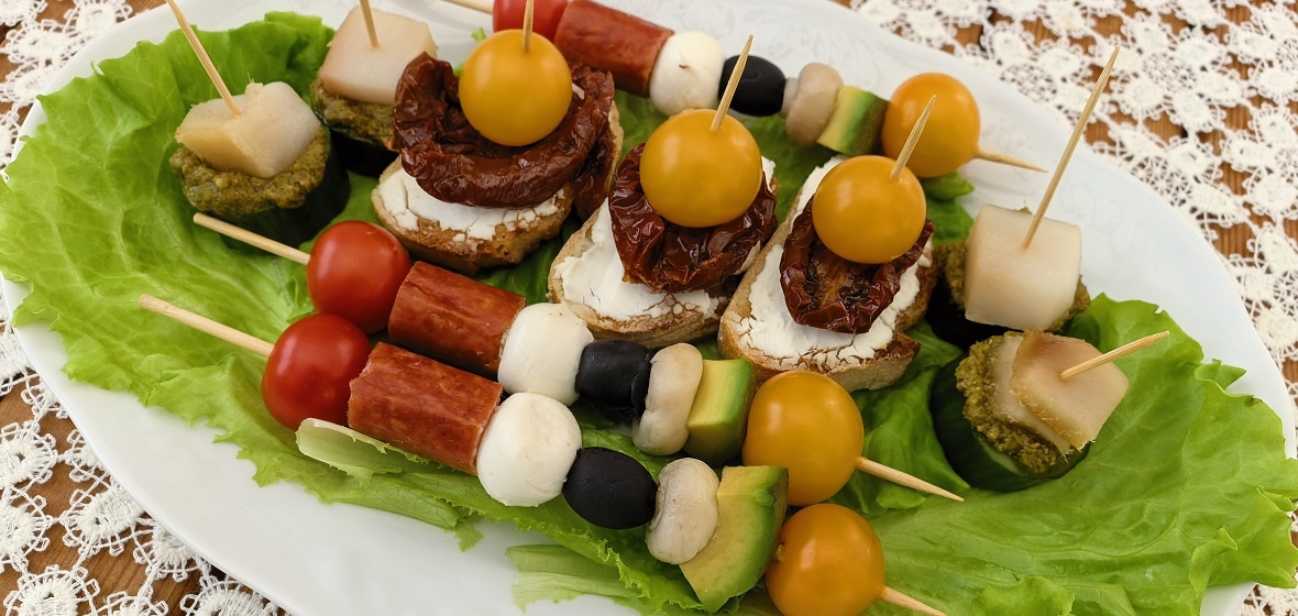 - Первый вариант: шпажки с черри, шампиньонами, маслинами, колбасками, авокадо и мини-моцареллой. Для этого потребуется: