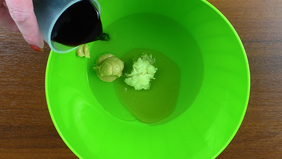 Начните с приготовления маринада: в глубокой миске смешайте мед (желательно жидкий, чтобы легче растворился), чеснок, масло, горчицу и соевый соус. Попробуйте на вкус и при необходимости добавьте соль и ваши любимые специи, учитывая, что соевый соус уже достаточно соленый.