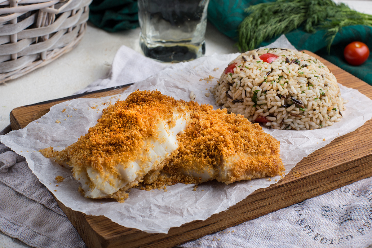 Предварительно разогреть духовку до 180°C. Рис промыть до чистоты воды, затем залить 500 мл и довести до кипения. Добавить соль и варить на низком огне под крышкой 20-25 минут, время от времени добавляя кипяток, если потребуется.С апельсина счистить цедру, избегая белой горечи. Измельчить чеснок и в блендере смешать его с панировочными сухарями, апельсиновой цедрой и 30 г сливочного масла, доведя до крошкообразного состояния.Филе рыбы очистить от костей, приправить солью и перцем, затем обвалять в полученной панировке. Выложить на противень, обтянутый пергаментом, посыпать оставшейся крошкой и запекать в течение 15-20 минут.На сковороде с сочетанием сливочного и растительного масел обжарить рис с разрезанными пополам помидорами черри и кориандром в течение 1-2 минут. Добавить порубленный укроп, перемешать и подать вместе с запеченной треской.Это блюдо обещает яркие эмоции и наслаждение вкусом. Приятного аппетита!