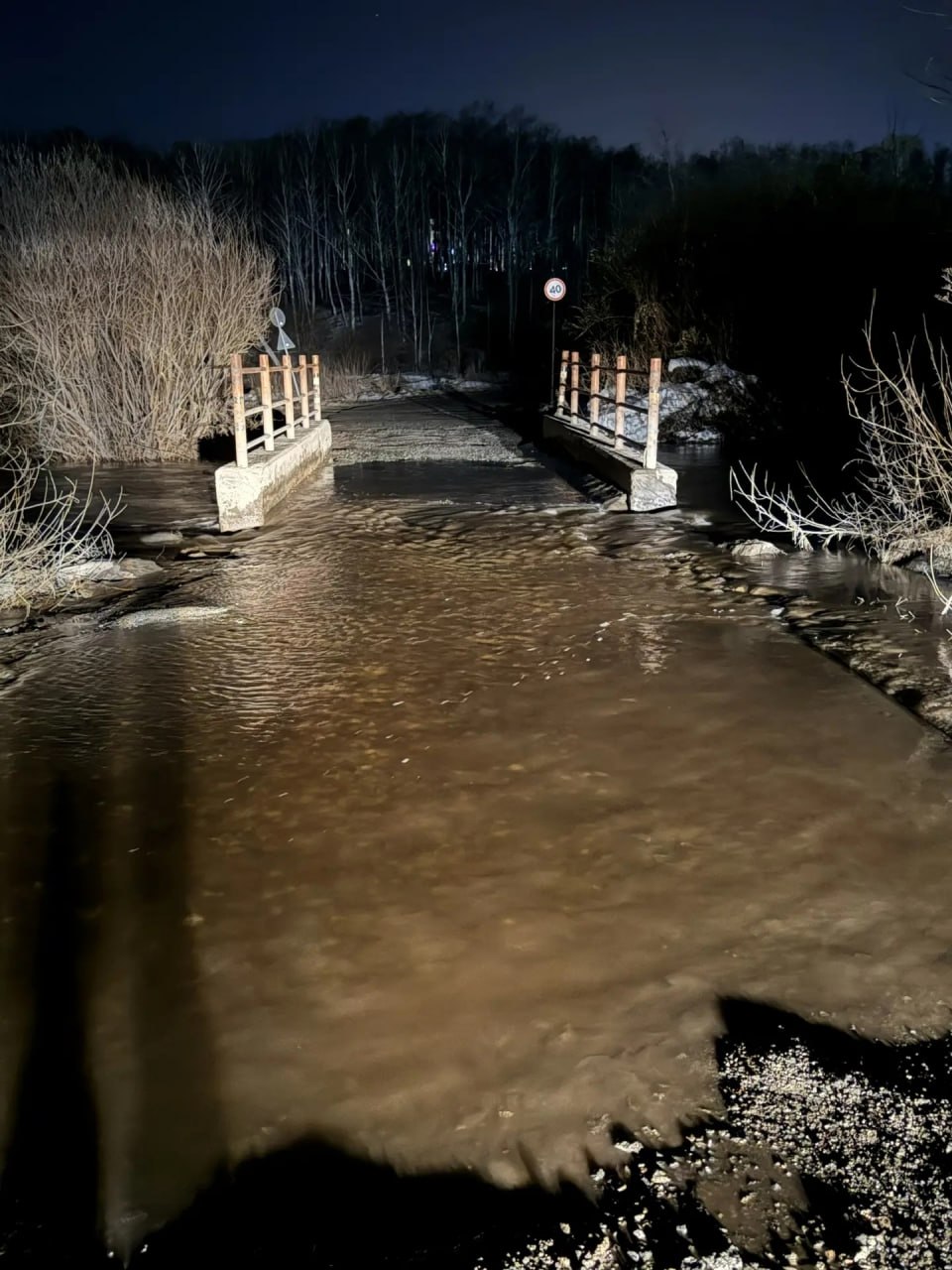 Мостик неофициальный, уходит под воду практически каждую весну. Власти следят за уровнем воды и заранее перекрывают движение.