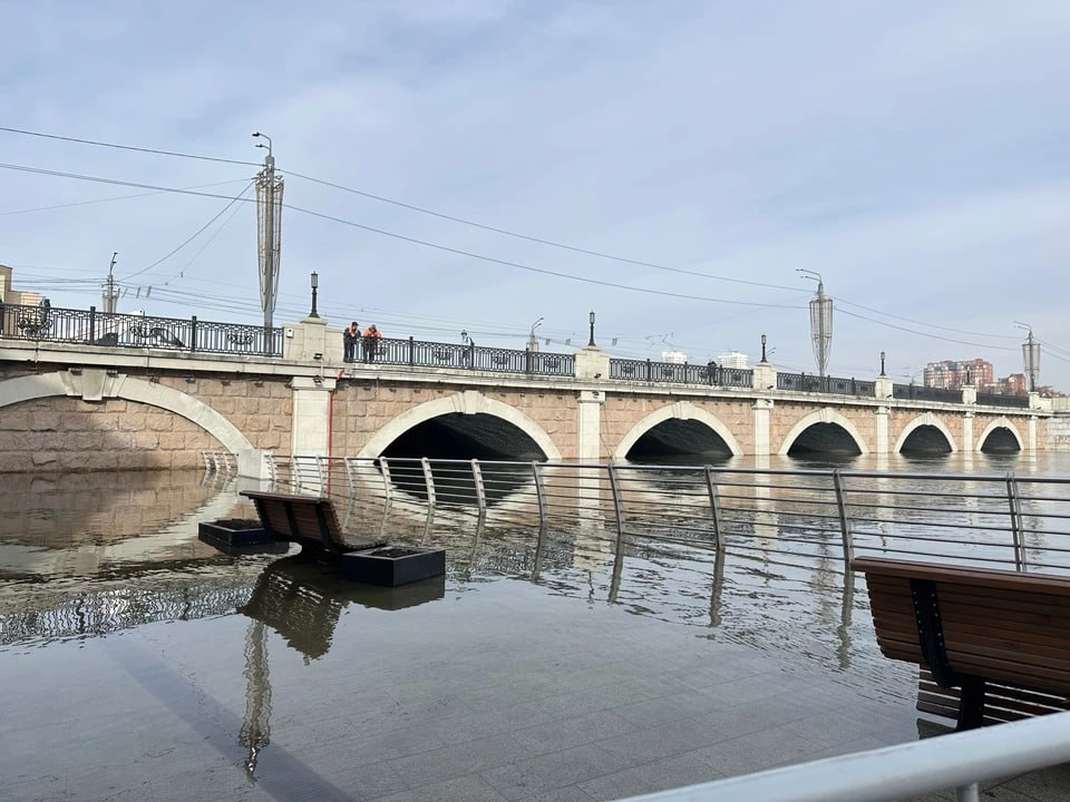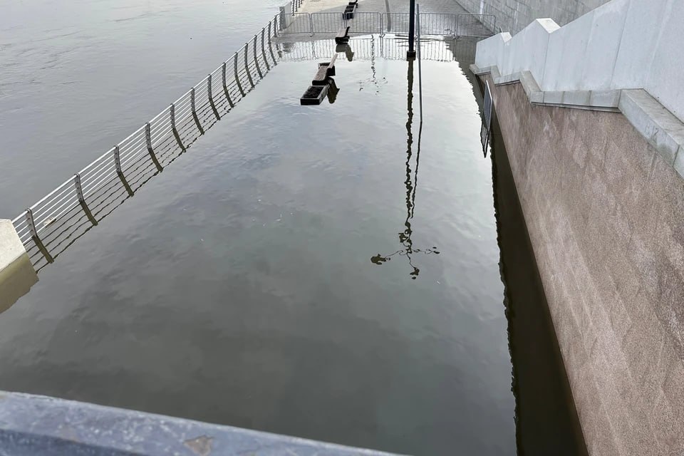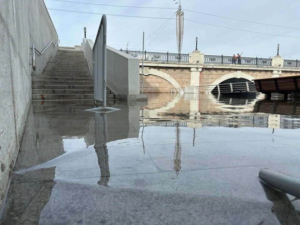 Из-за увеличения сброса на водохранилище на набережной реки Миасс в центре Челябинска становится все больше воды.