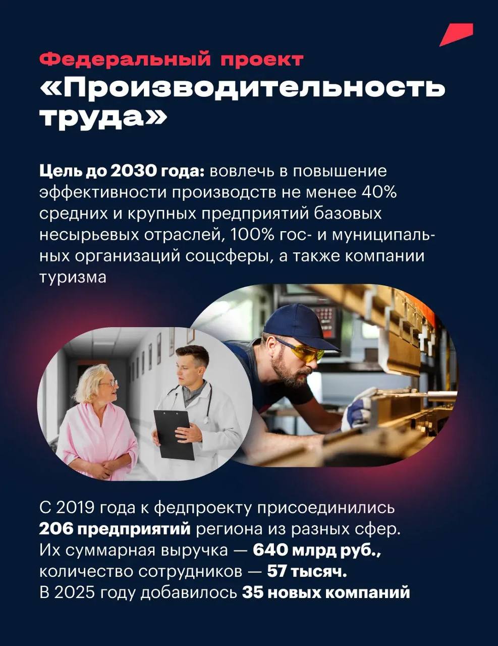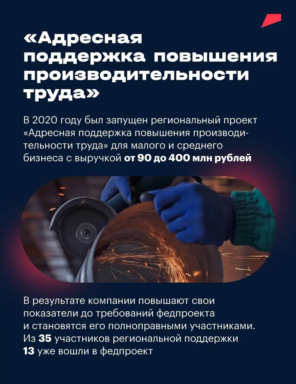 К федеральному проекту «Производительность труда» каждый год присоединяются новые предприятия региона из разных сфер. В результате компании увеличивают выработку, экономический эффект, сокращают потери на производстве. Отмечу, что дополнительно у нас действует и региональная программа «Адресная поддержка повышения производительности труда». Она помогает предприятиям малого и среднего бизнеса улучшать показатели и в дальнейшем становиться участниками федерального проекта.