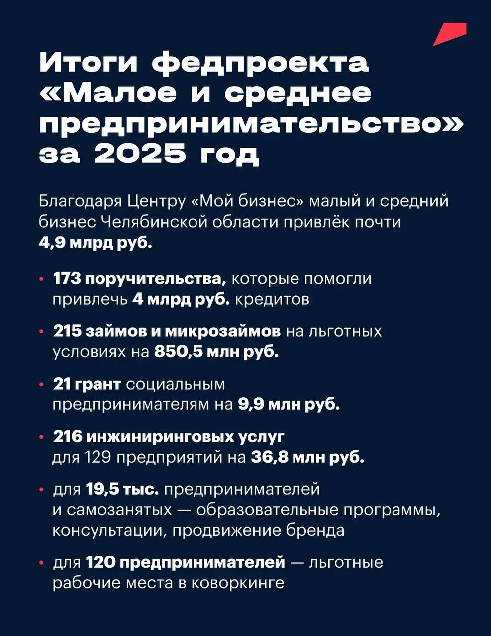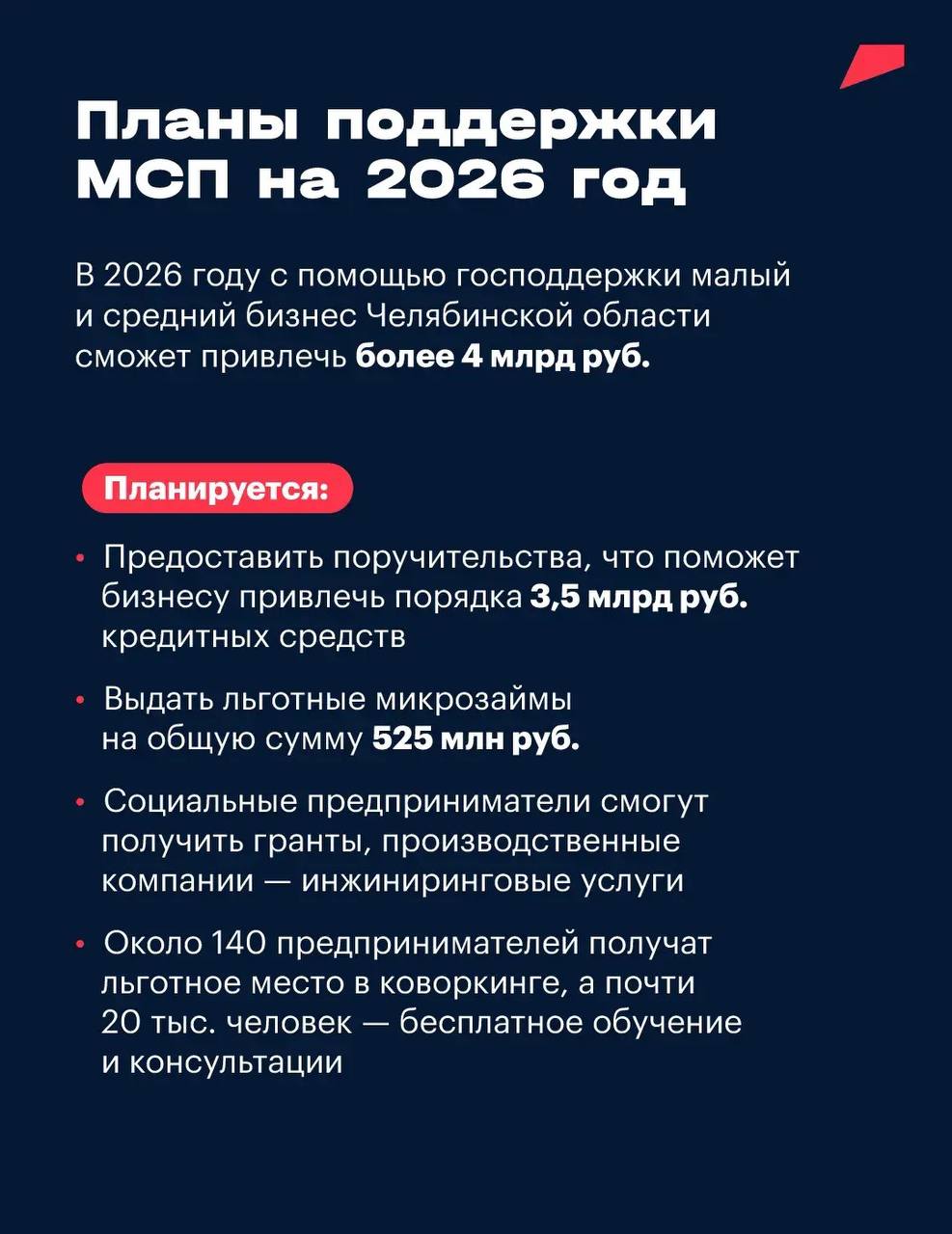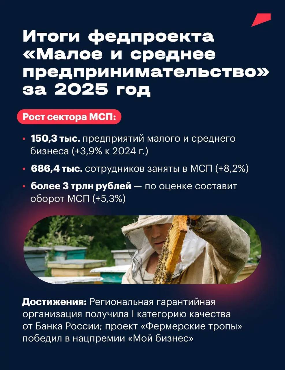 В 2026 году эту работу продолжим. Планируем расширять проекты по повышению производительности труда, усиливать региональную адресную поддержку, сохранять финансовые и консультационные инструменты для малого и среднего бизнеса. Отдельное внимание — высокотехнологичным компаниям, сельхозкооперации, агротуризму, микробизнесу и программам для участников СВО. Все подробности о результатах и планах — в карточках.