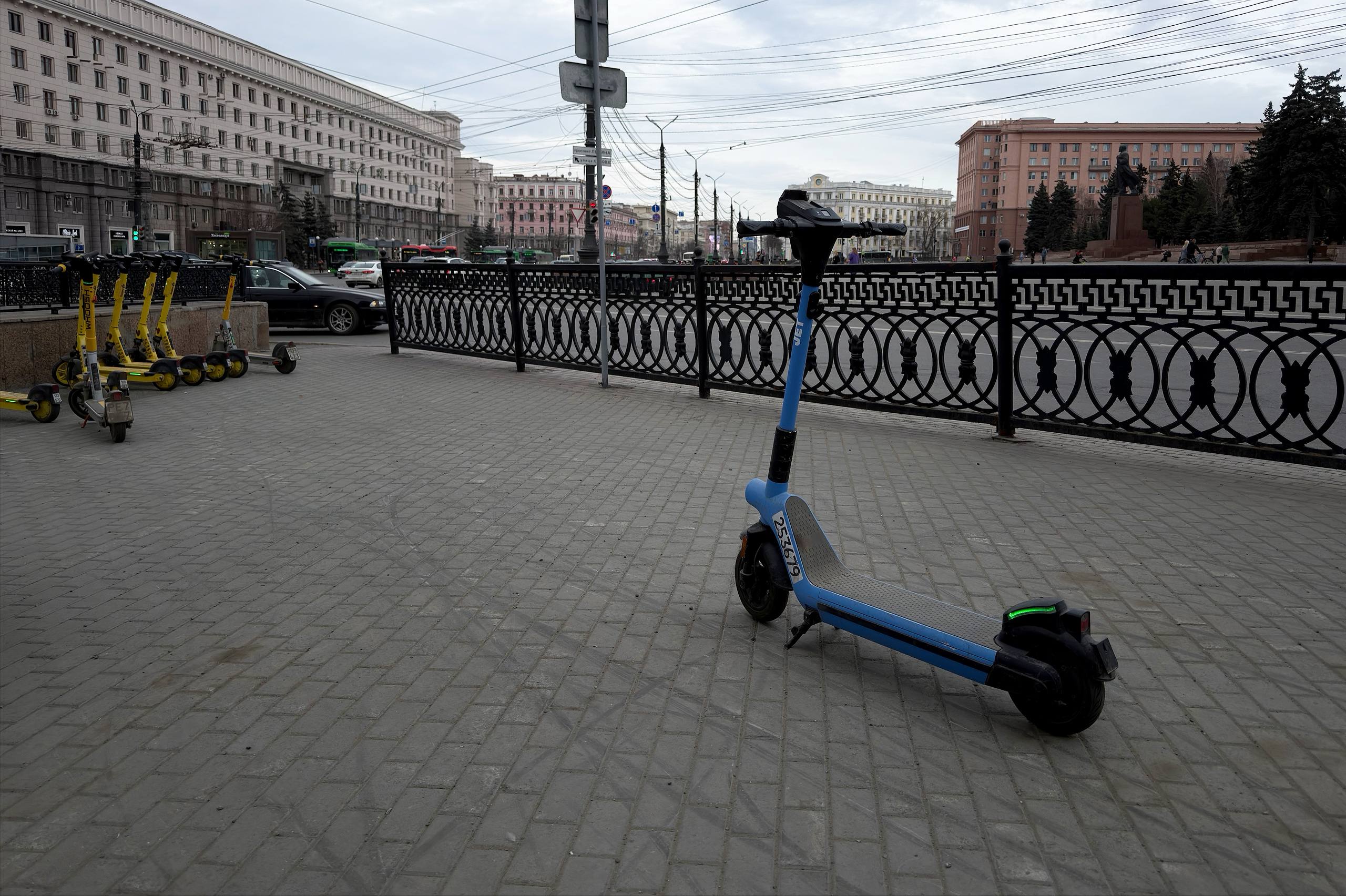 В Челябинске появились голубые электросамокаты? Один из таких замечен на площади Революции. Желтые собратья сразу изгнали голубого товарища.
