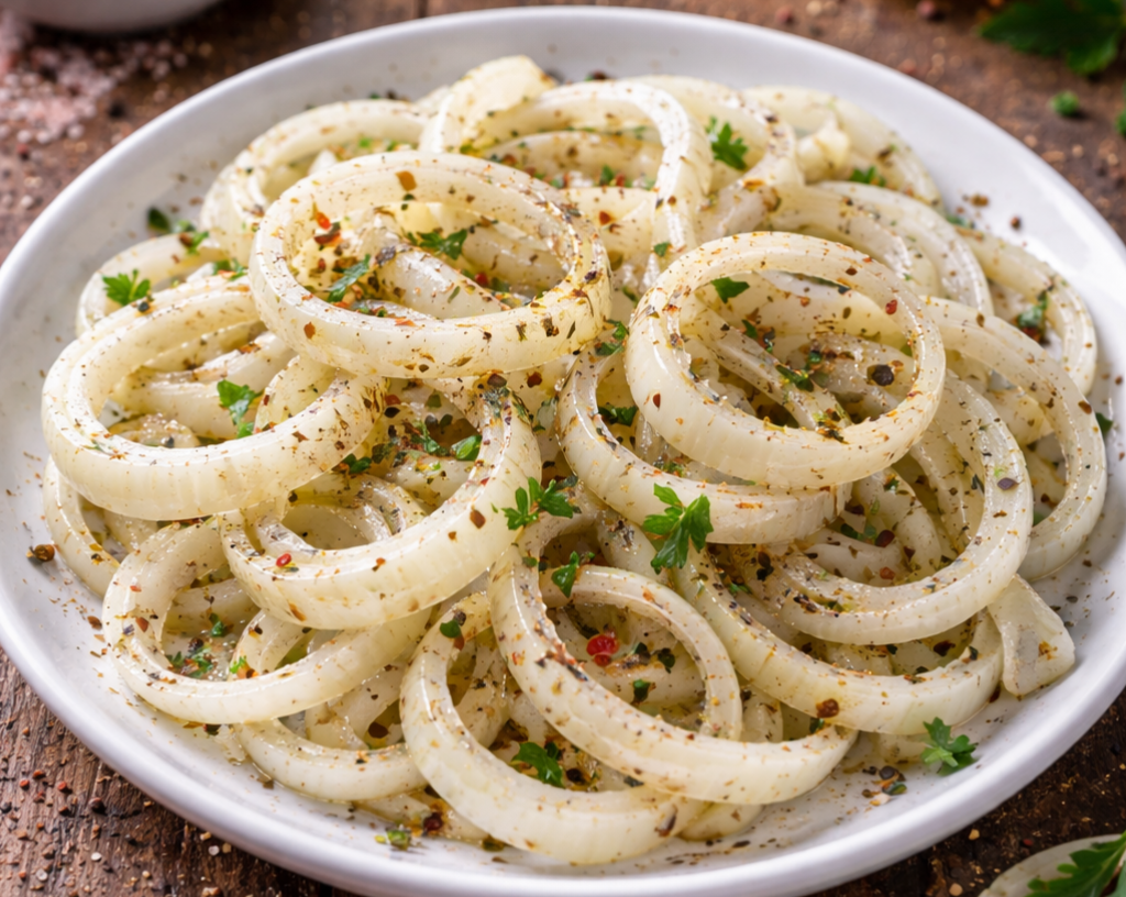 Это блюдо сочетает в себе пикантность репчатого лука с лёгкой сладостью, что делает его уникальным. Салат идеально дополнит любое мясное, картофельное блюдо или даже просто подаётся с ломтиком хрустящего хлеба.
