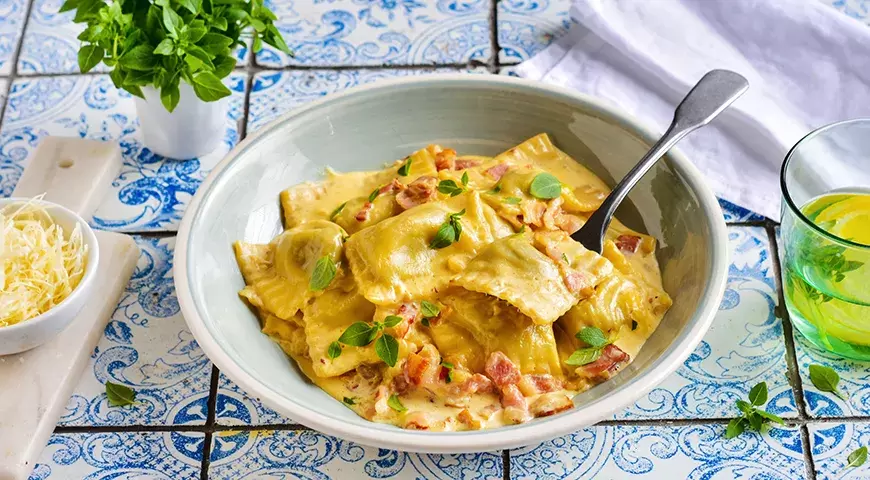 Равиоли карбонара — это смелая интерпретация знаменитой пасты, которая сочетает в себе традиционные итальянские элементы с новыми кулинарными подходами. В этом блюде тонкие равиоли становятся базой для неповторимого сочетания нежной начинки и сливочного соуса, восторг кулинаров и любителей пасты обеспечен.