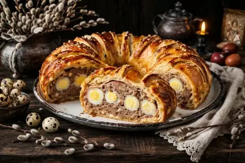 Это мясное кольцо станет не только вкусным добавлением к вашему столу, но и настоящим украшением, привнося в атмосферу семейного праздника особую торжественность. Подавая его с зеленью и крашеными яйцами, можно создать великолепный комплимент к основному блюду. Такой подход гарантирует, что ваш стол станет центром внимания!