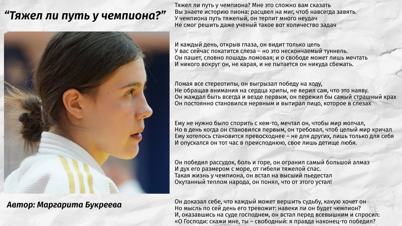 Маргарита Букреева живет в Челябинске, но регулярно ездит на тренировки в родной Еткуль, успевает совмещает занятия спортом с учебой и… литературным творчеством. Девушка описывает в стихах свой непростой путь к вершинам.