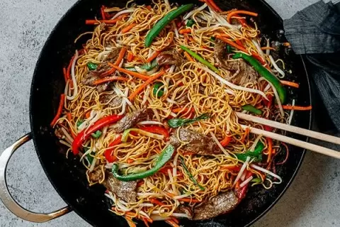Теперь добавьте морковь, болгарский перец и зелёный лук, и обжаривайте их, пока они не станут мягкими. Затем добавьте лапшу и говядину, полейте соусом и тщательно перемешайте. Готовьте, пока соус хорошо не впитается в лапшу. Подавайте горячим, наслаждаясь уникальным вкусом блюд китайской кухни!