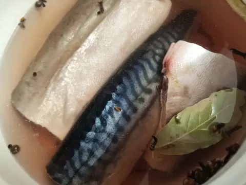 Сначала следует подготовить рыбу: разморозить, удалить внутренности, обрезать плавники и промыть под холодной водой, обсушив её бумажным полотенцем. В кастрюле смешать воду с солью и специями, немного подогреть, чтобы соль растворилась. Положить рыбу в рассол, обернуть пленкой и оставить в прохладном месте на 24 часа.