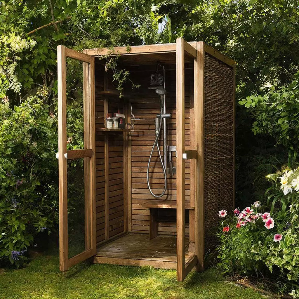 Кабинка может быть выполнена из различных материалов: от каркасной конструкции из дерева до более прочной из профилированной трубы. Основная забота — убедиться, что каркас сможет выдержать вес полной бочки. Угловые соединения должны быть прочными, а стенки оклеены влагостойкой фанерой, поликарбонатом или другим подходящим материалом. Часто одну или две стенки делают из более тяжелых материалов, чтобы защитить от ветра, а другие — для лучшей вентиляции.