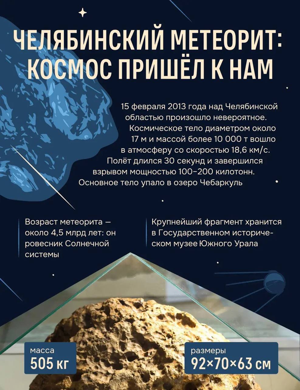Однажды космос сам решил навестить Южный Урал. 15 февраля 2013 года над областью прошёл метеорит, ровесник Солнечной системы.