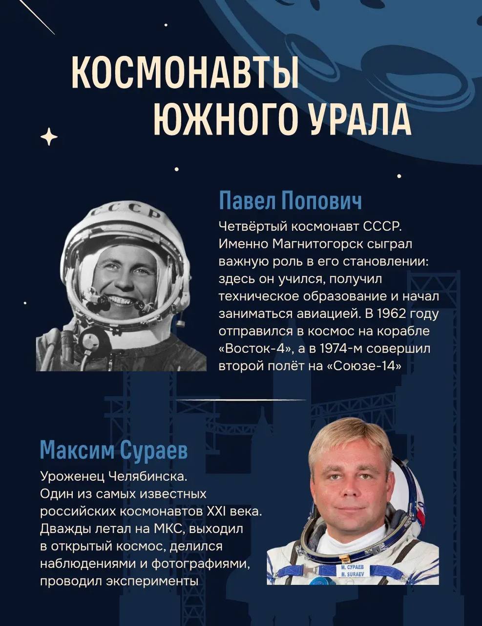 Южный Урал связан с космосом через людей, заводы и открытия. Наши космонавты: Павел Попович, Максим Сураев, Дмитрий Петелин и Олег Платонов. На южноуральских заводах выплавляли металл для первых спутников, собирали двигатели для «Востока» и «Союза», испытывали «Буран», в том числе руками лётчика Юрия Шеффера. В Миассе проектировали ракеты.