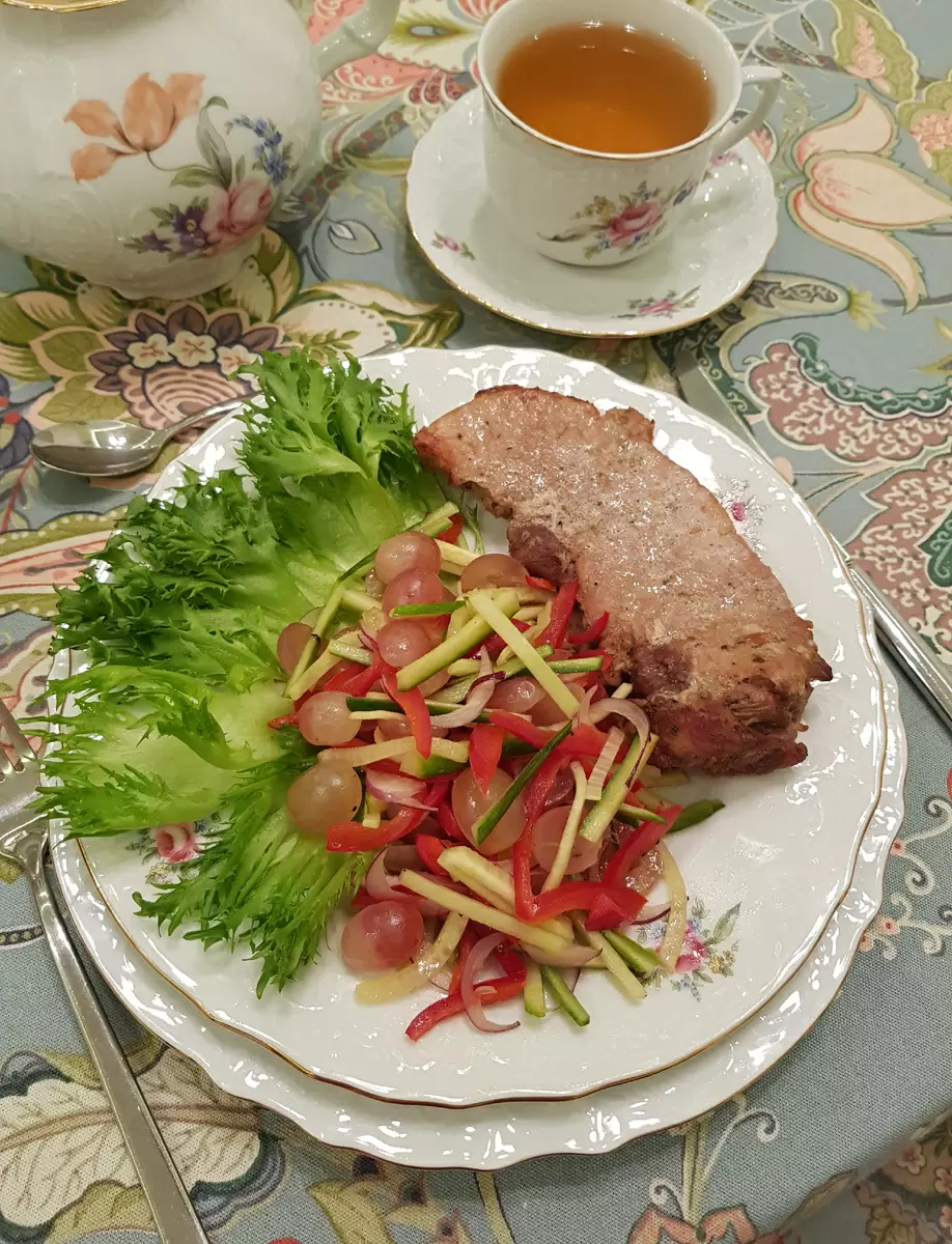 Для овощного салата все ингредиенты нарезаются: перец и огурец соломкой, лук – перьями, а виноград – пополам. Салат заправляется соком лимона, маслом, солью и перцем. Затем все ингредиенты перемешиваются и выкладываются на листья салата вместе с нарезанным запечённым мясом. Это чудесное блюдо станет не только украшением стола, но и настоящим кулинарным шедевром.