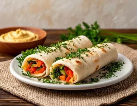 - Овощная закуска в лаваше с хумусом: Используйте тонкий лаваш, свежие овощи, хумус и зелень. Просто нарежьте овощи, намажьте хумус на лаваш, положите овощи и сверните рулетом.
