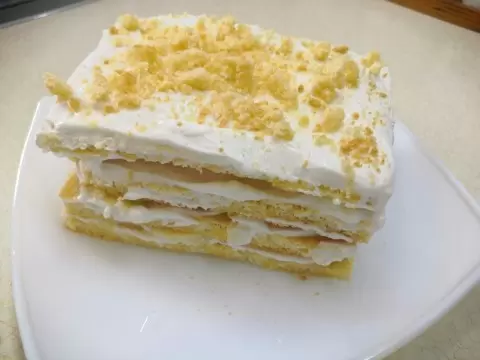 Приготовить крем: мягкий творог смешать с подсластителем, а банан нарезать на тонкие кружочки. Затем, чередуя бисквит и крем, выкладывать их на блюдо, добавляя банан, а сверху все посыпать крошками бисквита.