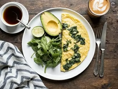 Завтрак: Омлет с зелёным луком, шпинатом и куркумой acompa?ado с половиной авокадо и салатом из огурца с оливковым маслом. Напиток — цикория с кокосовым молоком. Желательно добавить БАДы: селен (100 мкг) и витамин C (250 мг).