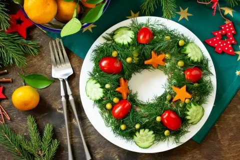 Вдохновляясь новогодними традициями, можно украсить блюда в форме часов, делая акцент на символизме времени в Новом году. Не забудьте про свечи и банты, которые легко сделать из моркови или огурца, добавляя к салату остроту.