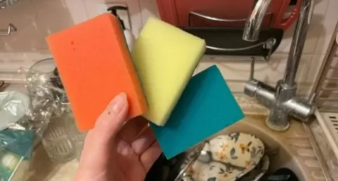 - Зелёная: используется для кастрюль и других сильнозагрязненных предметов. Её грубая сторона помогает справляться с пригоревшими остатками пищи.