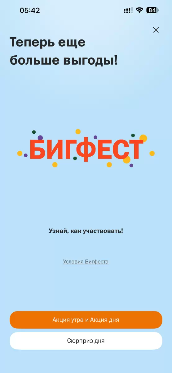 Бигфест — это масштабное событие, которое предлагает выгодные предложения на продукты как в утренней, так и в ежедневной акции. Это отличный шанс порадовать себя не только вкусной едой, но и ощутимо сэкономить.