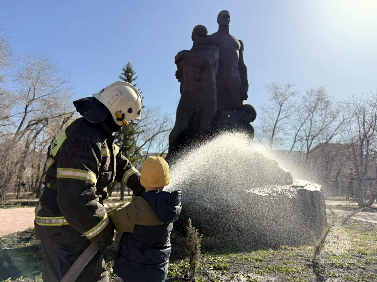 Сотрудники 36-й пожарно-спасательной части с удовольствием присоединились к благородной миссии по сохранению исторического наследия. Используя пожарный ствол, специалисты МЧС России вместе с юными жителями города привели памятник в порядок.
