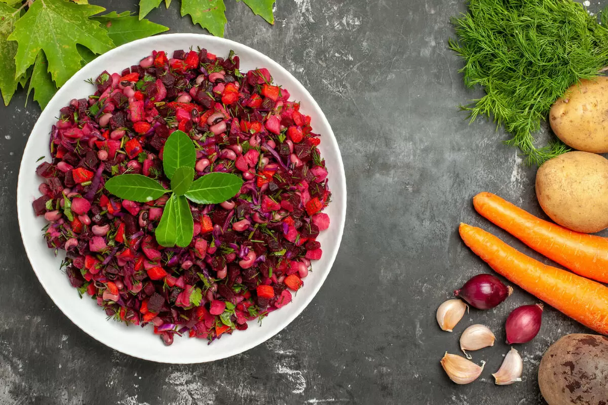 - Винегрет — современная версия этого традиционного салата включает дичь, отварной картофель, свёклу и маринованные огурцы. Всё это красиво выкладывается на плоское блюдо, а потом поливается заправкой из масла и уксуса.