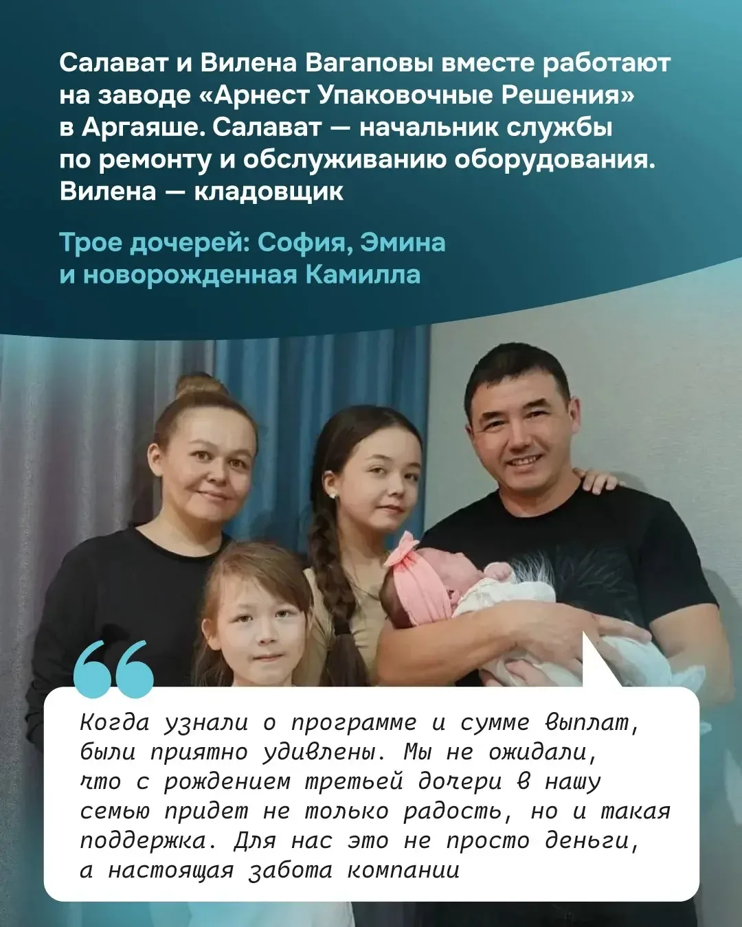 Аргаяшский завод «Арнест Упаковочные Решения» запустил для своих сотрудников корпоративную программу «Формула семьи». Это реакция на инициативу Президента России Владимира Владимировича Путина. Смысл программы в серьезной финансовой поддержке при рождении детей: 500 тысяч рублей за первого ребенка, 750 — за второго, миллион — за третьего и последующих. Это ощутимая помощь для молодых семей. Она отлично дополняет государственные меры в рамках национального проекта «Семья», а также региональные программы.
