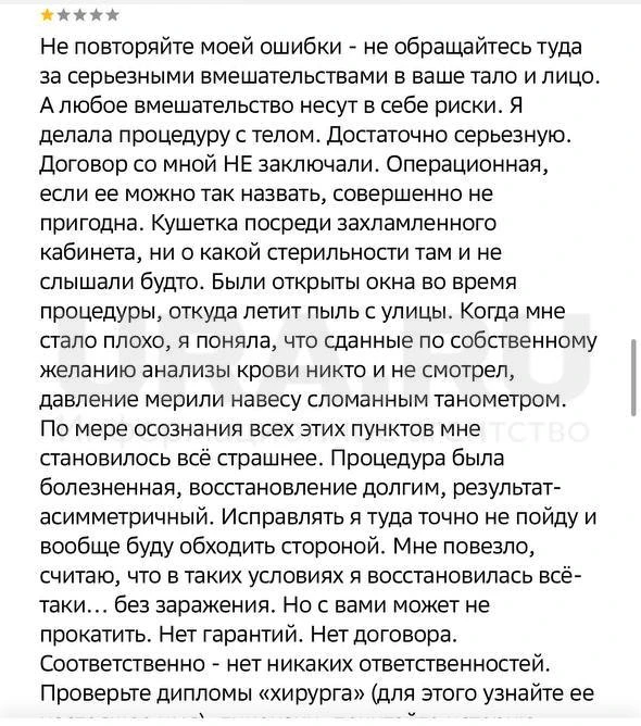 По информации источника URA.RU, на прием к начальнице попала 55-летняя женщина. После вмешательства у нее на лице в местах проколов образовались гнойные очаги. Другой девушке при блефаропластике повредили веко, поэтому ее глаз теперь не закрывается. Помимо этого, в клинике проводят интимное омоложение лазером, после которого у одного из клиентов диагностировали недержание мочи. Пациенты утверждают, что в помещении царит антисанитария, что подтверждают и отзывы.