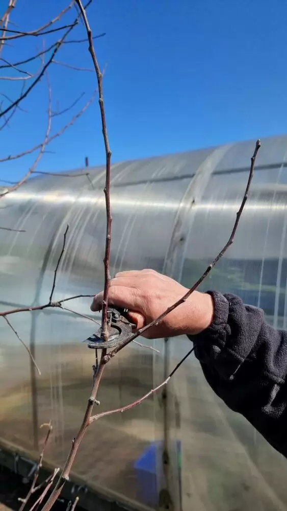 Черенки для прививок были срезаны в день работ с деревьев других сортов. Обмениваться черенками с соседями — отличная идея! Для черенков подходят верхушки прошлогоднего прироста, которые легко определить до первого утолщения на ветке. Важно, чтобы веточки были не тоньше карандаша и имели здоровые почки.