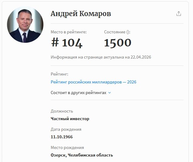 Андрей Комаров избавился от своего пакета акций ЧТПЗ, но остался одним из самых богатых людей России. Он занимает 104-е место в рейтинге.
