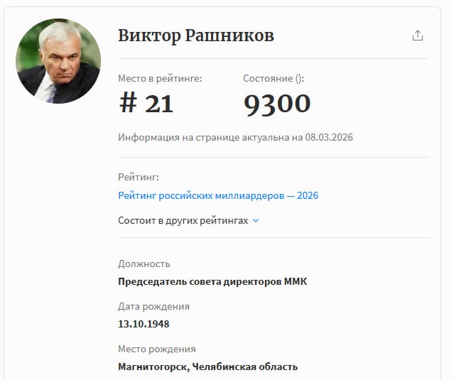21-е место в рейтинге занимает председатель совета директоров ММК Виктор Рашников. Любопытный факт: 140-метровая яхта Ocean Victory Рашникова занимает 16-е место в списке самых больших яхт мира по версии журнала Robb Report.