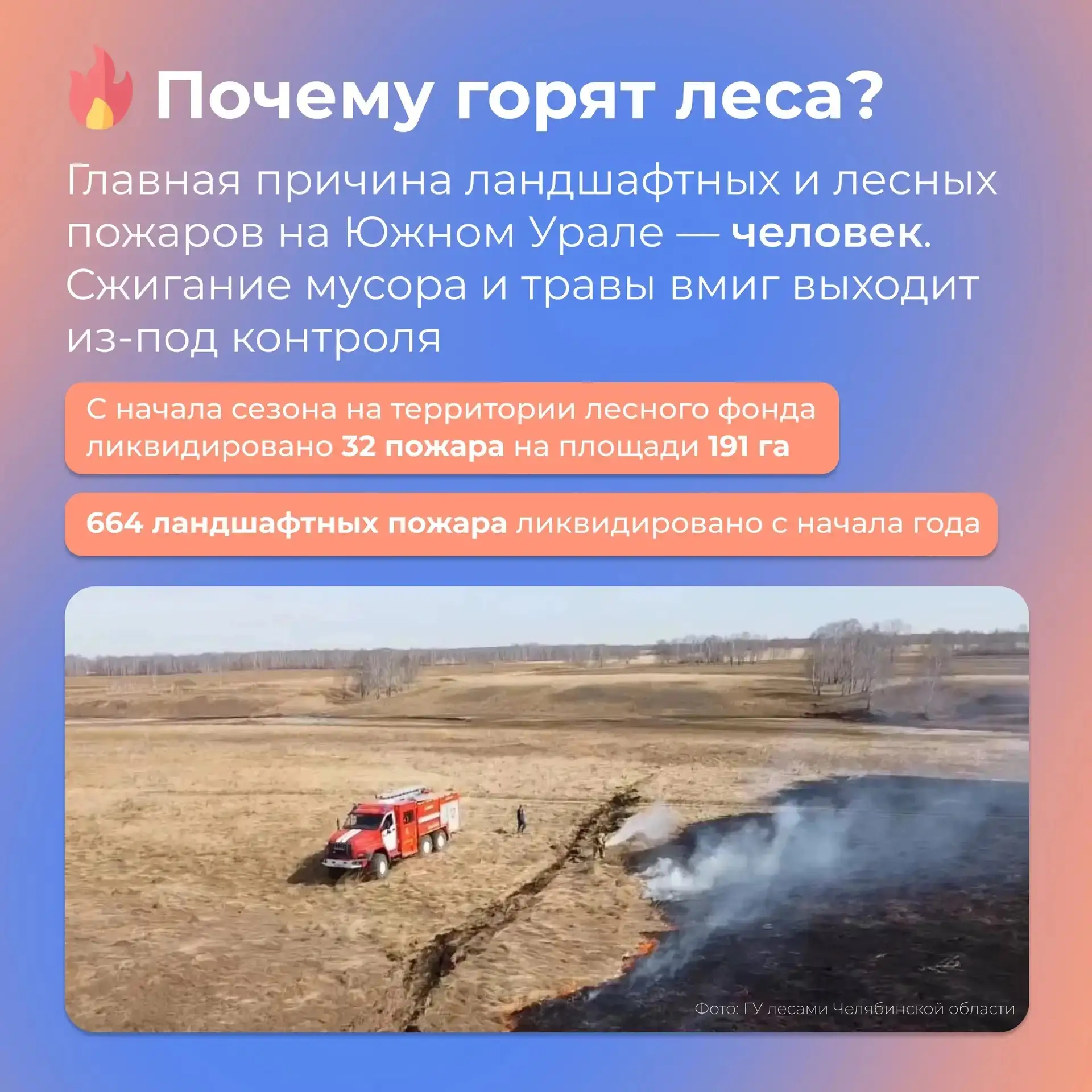 По информации ГУ лесами Челябинской области, в этом году в регионе возгорания уже зафиксировали в Аргаяшском, Брединском, Верхнеуральском, Карталинском, Каслинском, Красноармейском, Кунашакском, Саткинском, Чебаркульском и Шершневском лесничествах. Их удалось заметить на начальных стадиях. Все пожары потушили в первый же день.