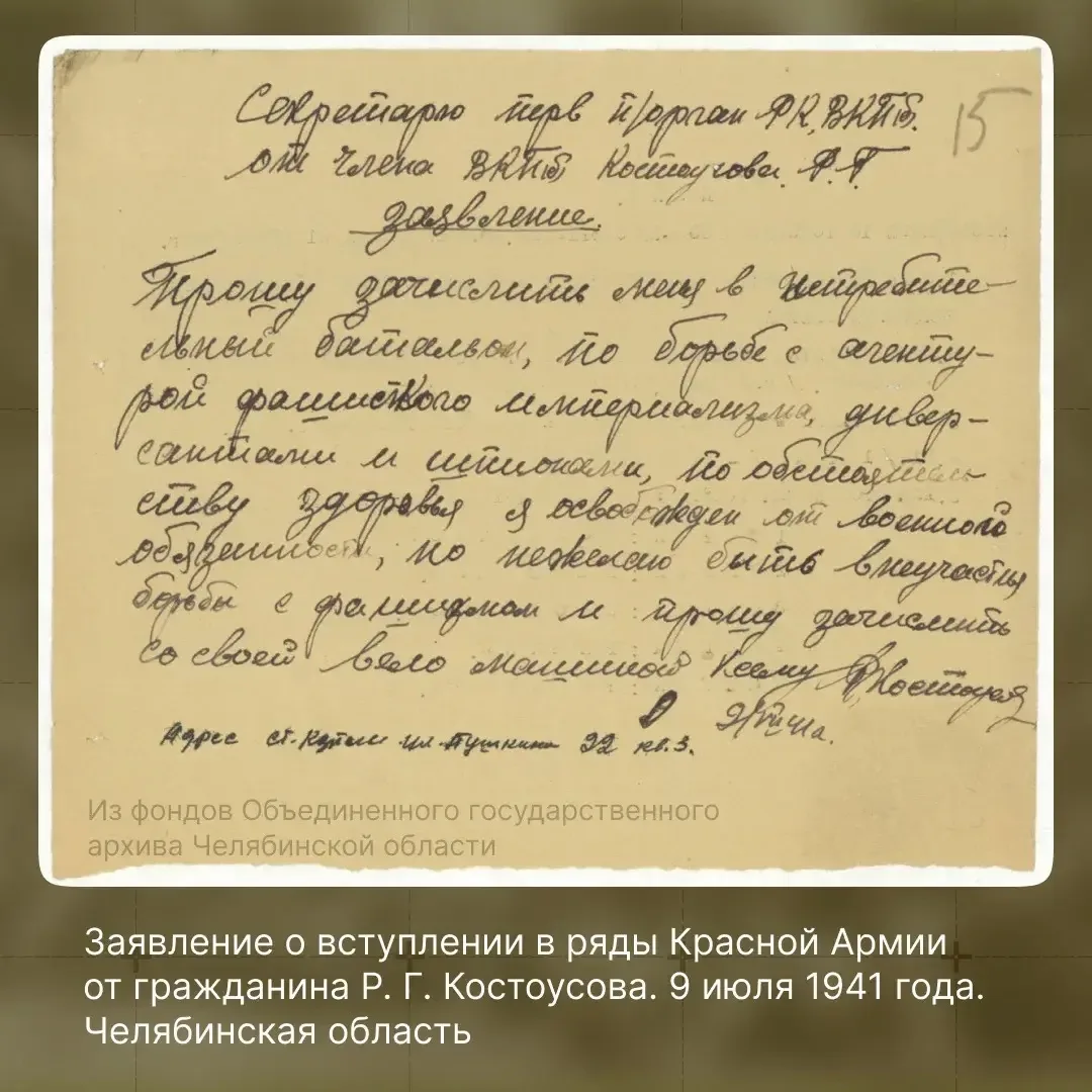 К 81-летию Победы Объединённый государственный архив Челябинской области открыл планшетную выставку «Прошу считать мобилизованным…» Судьбы и подвиги южноуральцев». На ней представлены судьбы солдат-добровольцев и мобилизованных: их боевой путь, их истории. Рядом — копии заявлений об отправке на фронт, поданных в военкоматы в первые дни войны, и краткие исторические справки об основных сражениях, в которых участвовали южноуральцы. Тысячи этих документов хранятся в архиве и впервые представлены широкой аудитории. Приходите увидеть за этими документами не статистику, а живую память о людях, которые сделали Победу возможной.