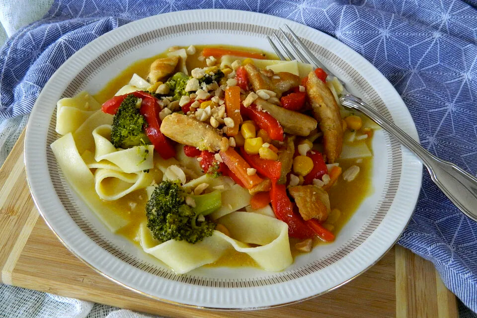 Сначала в сковороде разогревается немного растительного масла, после чего туда помещается курица. Как только она приобретет золотистый цвет, добавляется морковь и брокколи, а через пять минут – сладкий перец. После этого в сковороду аккуратно добавляется кукуруза с жидкостью, что предотвратит необходимость добавления воды. И, последним штрихом, засыпаются порубленные орехи.